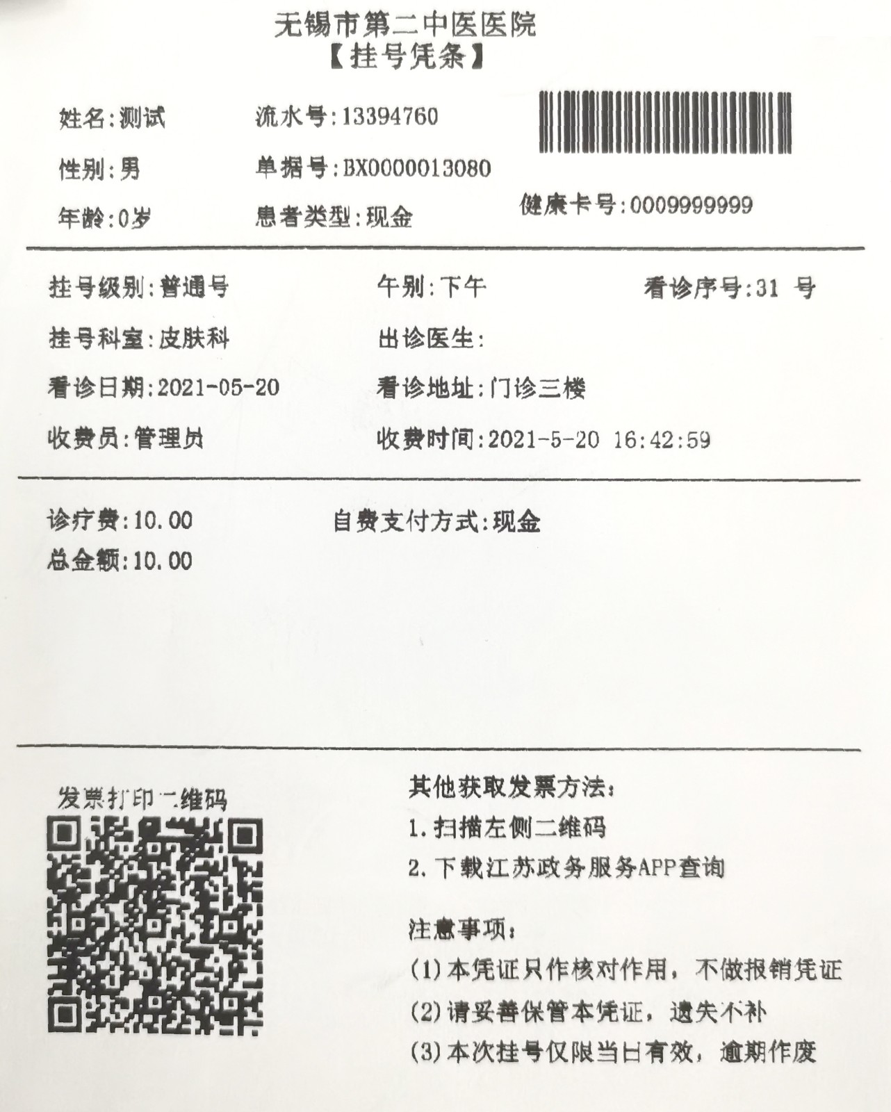 2、70岁以上老人挂号金额减免后为0的无法打印发票。